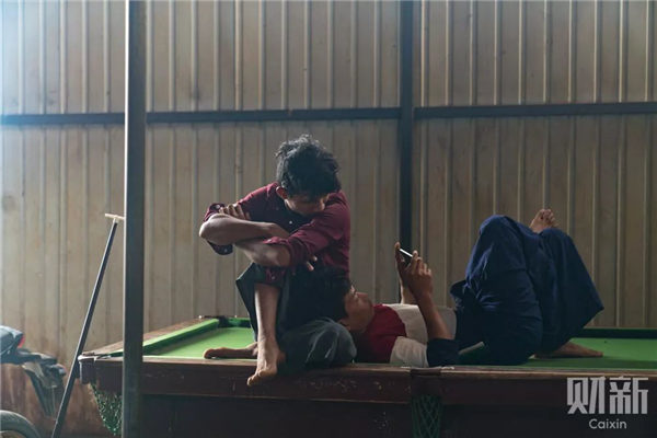 满载的车驶出,空出的车位就成了老缅的球场,所有的小伙子们都喜欢踢一种竹子编的球,香瓜大小,轻巧有弹性。一旦两台卡车之间空出了一个车位,“竹球”比赛就会立刻开始。一只垃圾桶每次都最先上场,它被推到场地一侧的中间位置,用来固定一根三米高的竹竿,竹竿上缠着的透明胶带就是他们的“球网”。比赛的场地类似排球,但只许用脚和头触球。SHINE TI是巴萨的球迷,正在用手机追着这个赛季的西甲联赛。他的手机没有4G流量,就翻看文字的报道。