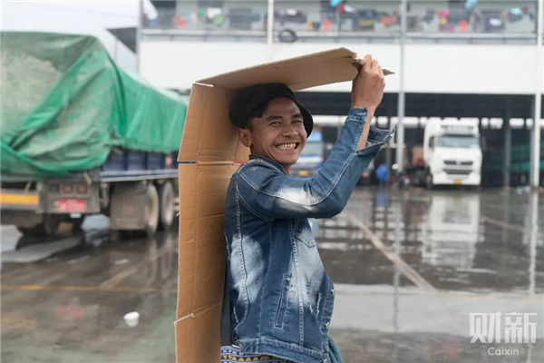 午饭后,躲在餐馆门口避雨的“老缅”。在这里,没人随身带伞,着急时随处可见的西瓜包装纸板便可充当雨伞。