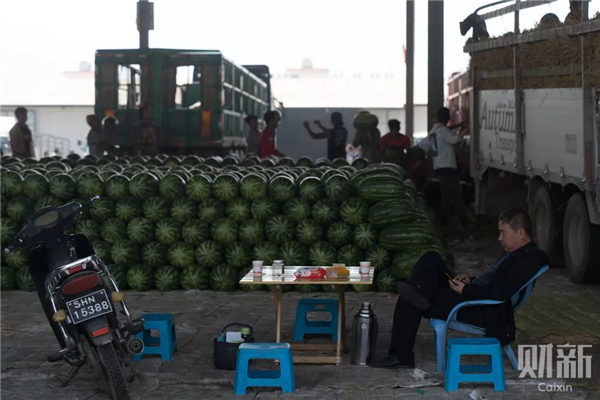 一名河北的西瓜商人坐在仓库里。今年春节期间西瓜行情跌得又早又快,令在瓜市上摸爬滚打了十多年的老江湖们咋舌。除了装卸工的工费没怎么涨,仓储、运费、包装费、过磅费、税收都有上涨。