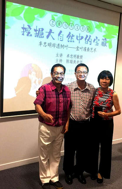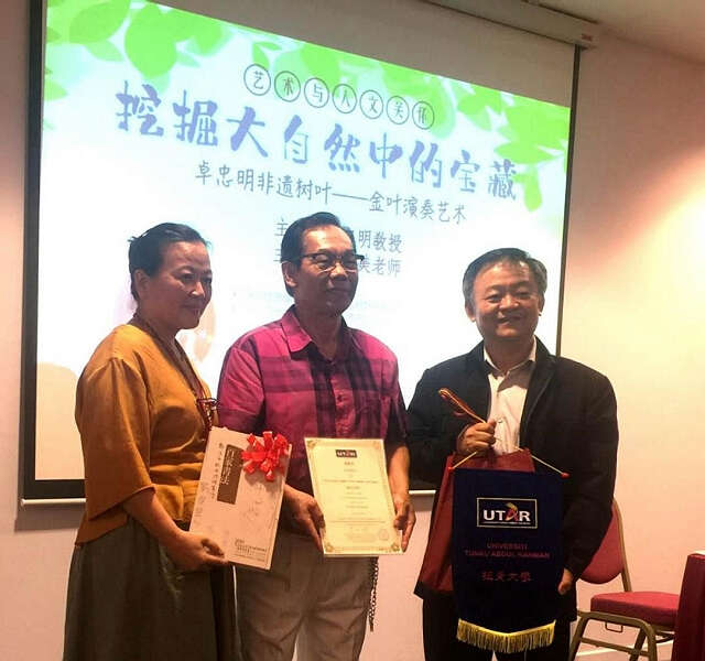 3日2O日,我和暨大同学陈君镇,助理李言三人遵照习近平主席的嘱咐"把中华优秀文化传播到五湖四海",应马来西亚名牌高校一一拉曼大学的盛情邀请,作了"挖掘大自然宝藏∽卓忠明树叶金叶吹奏艺术"