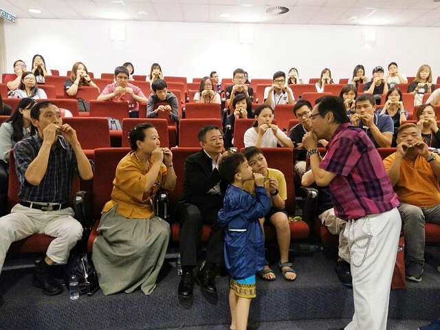 我用树叶和金叶吹奏了"北风吹"、"我爱马来西亚"、"康定情歌"、"莫斯科郊外的晚上"、"美丽的西班牙女郎"、"喀秋莎"。为了丰富吹奏感染力,我加上了单吐、滑音、颤音,以及二部三部轮吹等技法。整个会场自始至终掌声不停,笑声阵阵,激情不断。在黄院长等人的带领下,全场人人手持一叶,呼呼连吹,约40分钟内,便有6人吹响了树叶。除黄院长之外,还有印度籍学生,及年仅8岁的孩子。他们是拉曼大学首先吹响树叶的先驱者,大伙敬称他(她)们是"拉曼未来之声“。每当一个人吹响一声,全场就响起雷鸣般的掌声 !