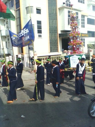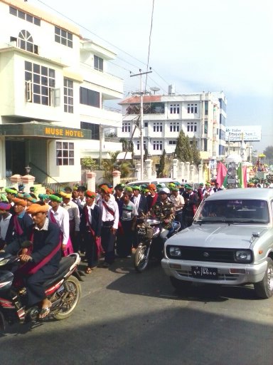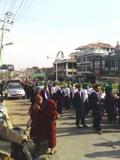 3月15日,缅历直榜月盈日(Full Moon Day of Tabaung),这天早上九点钟左右,我正陪着来自仰光的朋友T君在茶店喝茶,忽然只见大马路上人头涌动,一群又一群的勃奥人从市北郊地区不断地涌进来。我见状不由得大喜过望,招呼T君说:“你真好运气,正好碰上勃奥人的游行队伍,快拍下几张相片留念吧。”