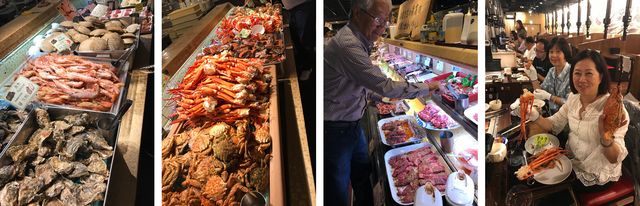 日本是个岛国,盛产海鲜。我们慕名自费在札幌的一间名叫“难陀”(Nanda)餐厅品赏海鲜自助餐。因生意太好,食客都需提前预定。每位5000日元,座位上有个计时钟,可任食1.5小时,超时食用另外计费。各种海鲜,肉类,水果,饮品,甜点应有尽有,肚量小如我者根本品赏不过来,只好望物兴叹。
