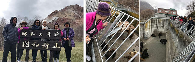 昭和新山,是北海道有珠郡洞爷湖附近的活火山之一,我们在山脚拍照,能看到山腰处还在冒着火山浓烟。昭和新山附近有个熊牧场,养着100来隻棕熊,参观站有小卖部,游客可买10日元一包的小饼干去喂熊。