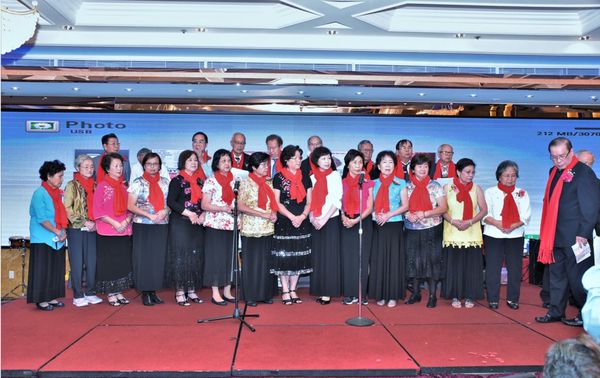 娱乐节目登场,首先是南加南友会,歌咏队的大合唱,“歌唱祖国”由黎天宝、张少应、朱徐佳、林碧华领唱嘹亮的歌声唱出我们对伟大祖国和家乡的热爱,歌声振奋人心,连坐在贵宾座的中国领事深受感动,情不自禁开口和唱起来。 “我的中国心”一石激起千重浪,歌声悠扬激情澎湃,唱出了我们海外华人,无论走到世界那个角落,心向祖国,我们中华民族海外儿女的心声永不改变。北加南友的“红河谷”和“永远是朋友”也非常精彩,扣人心弦。以林碧华、丘丽琴、雷倩美、谭美意、林慧吟,我会舞蹈组的“月亮船”,她们舞技精湛,动作柔美轻盈。雷倩美老师舞蹈功底深厚,她演出的“江南雨”和舞蹈功底深厚的陈幼群演出的“青花梦”充分演绎出江南美少女的体态轻盈,心灵手巧,婀娜多姿。南友会健身班的林碧华、谭美意、伍全礼、古月云、林慧吟、谭秉辉表演的莲花太极扇,在雷倩美老师的严格、细心指导下真是严师出高徒,他(她)的动作整齐划一,打出了高水平。还有北加南友会歌唱好手,缅裔会的歌伴舞,个个都演出了高水平,赢得此起彼落,连绵不绝的掌声和欢呼声,晚会在歌声、欢声笑语中渐渐落下帷幕。