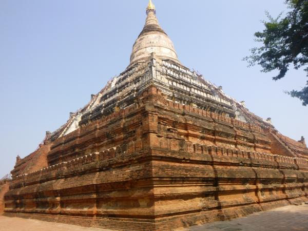 在这些寺塔中,最早的大型寺塔很可能是瑞山都塔(Shwesandaw Pagoda)。阿奴律陀王(King Anawrahta,1014-1077,1044年登位)于1057年建。阿奴律陀王攻占南方孟族的直通王国(Thaton)后,得佛祖发舍利,建塔供奉。瑞山都塔之南,另有小寺Shinbinthalyaung,很容易被人忽略。我们进内一看,有很大的卧佛,十分精美。