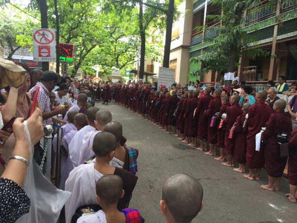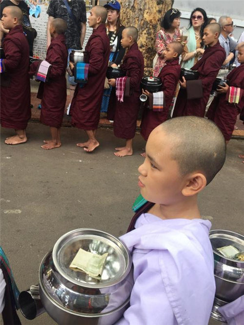 位于阿摩罗补罗附近的马哈伽纳扬僧院(Mahagandayone Monastery)始建于1904年,目前已成为全缅最大的僧院,据说有两千名僧侣在此学习。这个地方最著名的活动是“千人僧饭”,已被旅行社开发成为一个“旅游项目”。许多游客很早便在这里等候,以能布施。我们也在拥挤的人群中等了半个小时。在此之前,我乘着曼德勒清晨的凉风在街上漫游,看见过当地民人的施舍,而在此处布施已经变成了“表演”。我也乘机观察马哈伽纳扬僧院的食堂,有点像兵营,每张桌子上摆着六盘菜。缅甸的和尚是可以吃肉的,午餐的食物也包括了冰淇淋。马哈伽纳扬僧院僧人们排队进入食堂的仪式,与老挝琅勃拉邦的“清晨布施”十分相似,完全商业化的操作,只是商业化操作的手段略逊之。