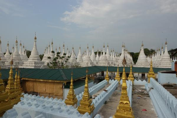 缅甸的司机有时也会做一点小弊,当我们要求去固都陶塔寺,却把我们拉到了山达穆尼寺(Sandamuni Paya)。该寺为敏东王悼念其弟加囊亲王(Kanaung Mintha)所建,1874年建成。加囊亲王本是敏东王登位的主要助手,也是王储,1866年被敏东王之子所杀,后埋葬于山达穆尼寺。山达穆尼寺建筑风格与固都陶塔寺相似。在中央宝塔周围有一千七百七十四座小塔,塔内有大理石板,镌刻佛经以及评论。我们不识缅文,两寺又如此相似,参观时错将山达穆尼寺当作固都陶塔寺,出来时手机定位完全不准。向着人群和旅游车的方向,我们才发现、走进真正的固都陶塔寺。