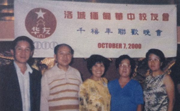 2000年10月7日,洛城华友在海星酒家举行千禧年联欢晚会,我一来到酒楼,见到朱徐佳,就问她:曾在腊戍中山学校当过老师的劳月姬同学今晚会不会来?她说,会来呀,你去墙上看看她编在哪一桌。我去到一看,原来她们夫妇和我们夫妇刚好编在同一桌,我赶紧去找,见她夫妇已坐在那里,我们见面,大家都欢喜万分地擁抱在一起,我们离别已三十多年,互道别后之情。