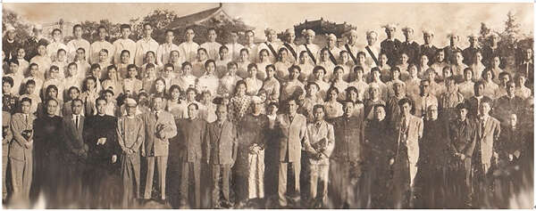 和周总理合照,后排左边10位白衣男生及前第三排右边12位女生都是华中的代表