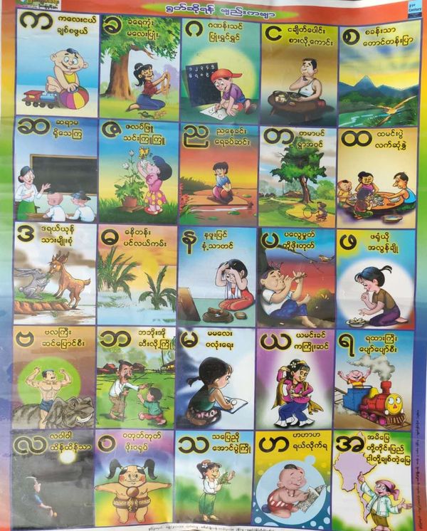 独立前我们入读小学时,初级课本叫"丁崩机",小学生读起来比较枯燥。独立后新编初级课本,所有字母加配歌谣彩图,小学生念起来朗朗上口,有趣好记。