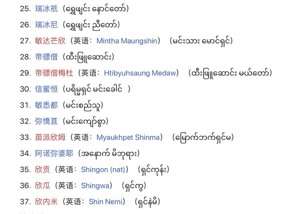 这三十七尊官封正神,<有民间村庄,家宅,个人的守护神,也有大自然中高山树林守护神>。因为他们照护人们,造福人们,受到人们尊崇和祭祀。与我们华人华侨最有缘份的缅神,据了因所知,是<宇迅支>。他是管辖咸水领域的神。居住在下缅甸三角洲一带的华侨华人多有经菅內河航运业务者,都会定期祭拜宇迅支。另一尊就不用了因多说了;就是<德贾敏>帝释,泼水节缅甸新年就是欢迎他下凡到我们人间,与民同乐,为民题示,指点来年大计。