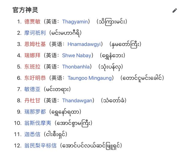 在维基百科中有这么记载:『缅甸纳信仰最重要的地点在蒲甘附近的波巴山,波巴山是一座有许多寺庙与遗迹的死火山,每年的神灵书(Natpwe)在缅历九月(约公历十二月)的月园日举行,祭祀官方37尊神灵。曼德韌北部的唐邦(Taungbyone)神灵节则在缅历五月(约公历八月)的十一日至月园日举行……一周后在阿摩罗补罗(Amarpura)的亚达纳古(Yadanagu)的神灵节。』现在将官方神灵(正神)抄錄於下: