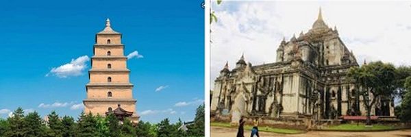 中国西安大雁塔(左)缅甸蒲甘达丙纽佛塔(右)
