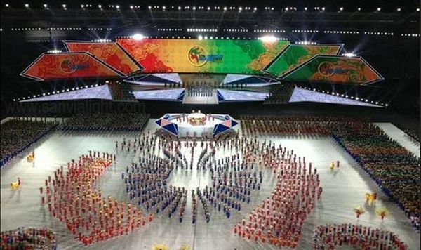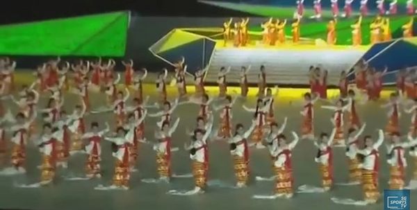 2013年第27届东南亚国家组织运动大会在缅甸首都尼比都隆重举行。开幕式和闭幕式上缅甸音乐舞蹈艺术家们精心苦练巨型音乐舞蹈,参演人数上百成千,上演节目古今俱全,华丽服饰闪闪耀眼,上台阵容厐大无比,队形队列变换无间,精彩程度前所未有,加上五彩灯照变焕无穷,忽暗忽明。充分展现了当代缅甸音乐舞蹈的高超水平,艺术巅峯。生平第一次观赏到如此精彩绝伦的音乐舞蹈史诗,叹为观止。