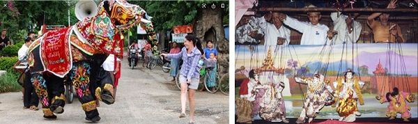 人扮彩象游街表演(左)缅甸民间木偶剧(右)