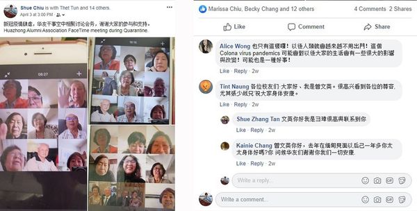Covid-19 肆虐,实施居家令期间,各项集体活动都停摆了。洛杉矶华中校友会原定今年9月举办30周年庆会,已预订了餐馆。风头下,唯有召开干事视频会议,进行空中商讨,并达成了共识。将视频放上脸书以便知会各位华友,却惊喜地联络到仰光的校友,互相问好。各方朋友跟上网络时代的步伐,现场不能见就空中见。