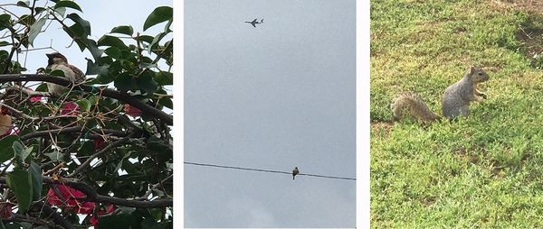 麻雀直接在花棚上栖息,棚下就是构杞树。燕子停在电线上伺机而动,飞机飞过也不惊。小松鼠也看上我的杞子了。