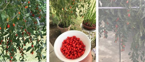 近来雨水充足,杞子不但提前开花结果,果实也比往年多而大,引来鸟儿啄食,赶紧拉网保护。