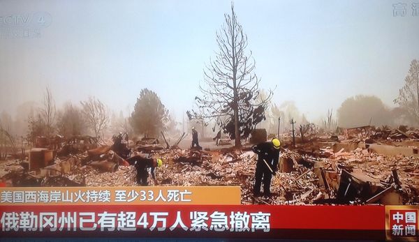整个加州处身火海之际,北邻俄勒冈州和其北华盛顿州也同时暴发山林大火,这样整个美国西海岸火海连片,身无完肤。到目前为止,已有近90场林火,期中3场范围破记录,死亡36人,失踪数十人。三万多消防员日以继夜奋力灭火,未能有效控制火势。9月14日,川普总统急忙前来加州视察火情。整个势态史无前例,非常严重。