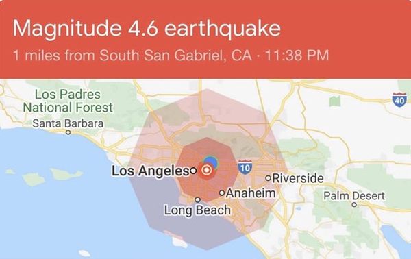 心神还未定,九月十八日地牛又来凑热闹,晚上十一点三十八分在洛杉矶伸了个懒腰,引发了一个4.6级不大不小的地震,幸亏只是短短数秒钟,没造成什么伤亡,但居民们确实受到了不小的惊吓。