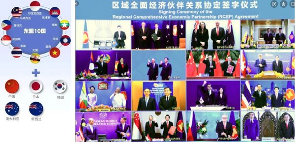 左:东盟十加五国家, 右:东盟自由贸易协定签字仪式