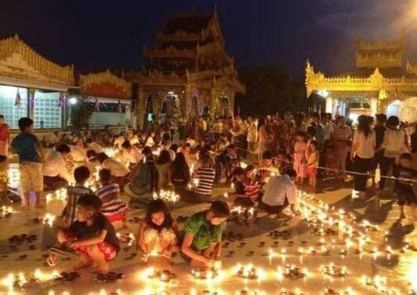 于是,这个习俗来源于缅甸佛教,民众和信徒在这一天都会去佛教堂拜佛,贡上些鲜花、水果和食品。也有一些家庭,他们会在寺庙做些素食,给每一位来到教堂的客人品尝美食。一年一度的点灯节,大家聚集在金碧辉煌的大金塔,在大金塔的周围,还有六十八个大大小小的金塔,使这一组建筑成为世界上最大的建筑群之一。瑞光大金塔广场一早就被朝圣的民众占满,有的在点灯,有的在唸经,有的向僧人们布施。瑞光大金塔朝圣民众络绎不绝,热闹非凡。大金塔金光闪闪,雍容华贵,善男信女们跪拜在佛塔之下。缅甸人对佛教的虔诚更是让人无法想象,虔诚地跪下磕头,他们对佛的虔诚着实让我为之动容。大金塔及其周边区域被节日的人流挤得水泄不通,热闹非凡。整个仰光的夜晚被笼罩在一片热闹祥和气氛中。