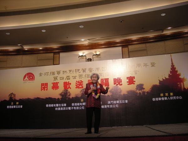 大会开幕晚宴上,重头戏粟秀玉老师致欢迎辞,喉音高昂,激情奔放,引起与会代表们共鸣。闭幕晚宴结束前,应与会代表们的要求,粟秀玉老师献唱具有缅甸农村浓厚色彩的缅语歌曲,那是敬爱的粟老师的一枝独秀,谁也无法攀比。台上老歌动听,台下掌声四起,歌声掌响融为一体,充满欢乐。