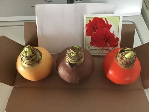 看看说明书才知道是三个花球根。是一种如百合花一样的花卉,每一技开四朵花。但特别的是这些花是不用浇水的,估计包装时已経在容器中放入了特别的营养物。也就是说,养花者什么也不用管,只等花儿自长自开,等着欣赏便行。哇!这不就是懒人的最佳礼物幺?