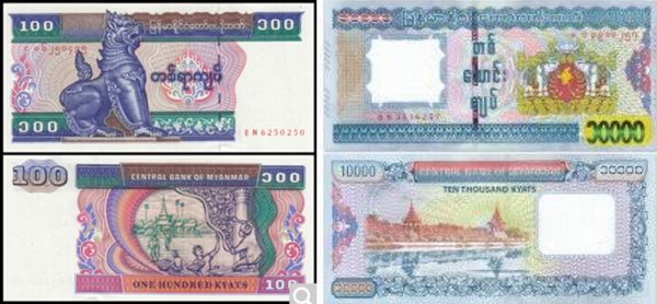 (左)过去缅币最大面值百元(右)现在缅币最大面值万元
