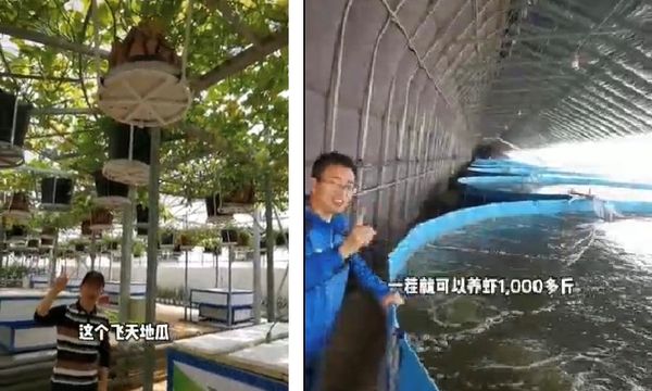 左:室内无土立体种植业, 右:棚内圆缸鱼虾养殖业