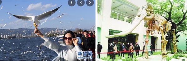 左:红咀鸥逗乐昆明市民,   右:中国甘肃省古野象遗骨复原图