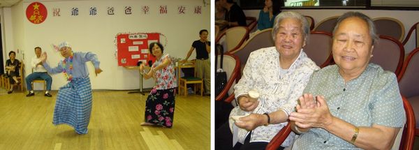 左:洛城华友缅装晚会舞蹈表演 右:朱妈妈(左)观看缅甸舞蹈