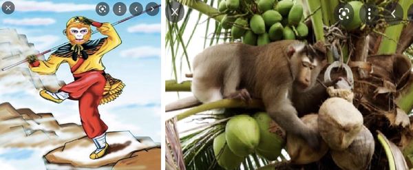 出国下南洋的福建人,多为经商谋生,小时候听大人们讲福建人开茶叶店的故事,有次老板叫得力助手带款回福建购买优质茶叶,一年后回来了,只带一包茶叶,老板不问青红皀白,一气之下,解了助手,顺手将那包茶叶扔进店里的茶堆里,上面添加新的茶叶,不久来他家店里买茶叶的顾客越来越多,都说现在他家的茶叶特别香,而且能治疗肠胃不好,关节炎疼痛的病人。老板加了几次新茶,效果一样神奇,原来那助手驯练猴子特地攀爬悬崖绝壁采集而得,他才想起那个助手,可再也找不到他了。仙茶是否如此神奇不得而知,可东南亚椰树林里,主人驯练猴子爬椰树顶端摘成熟椰果,确是真有其事。猴子能帮主人做很多事情,例如看家,开关鸡笼,挥棍赶羊群等,猴子能表演各种杂技,逗乐观众,我们夫妇刚到美国,为了提高英语说写能力,应对入藉考试,工作之余,去补习英语,老师除了授正课,也讲一些有趣的小故事:有一对夫妻,没有孩子,家里只养着一只小猴子,有一次女主人带着猴儿出外两日游,发生车祸,所有乘客身亡,只有小猴子安然无恙,回到家里,男主人问牠车祸经过,他说回来的时侯,他驾驶车辆,那司机呢,司机跑到女主人身边两人拥抱亲热,他驾车不小心,在大拐弯处车辆掉下深沟。学员们听了哄堂大笑。中国人最熟悉的猴子是,不怕天不怕地,神通广大的孙悟空神猴。在十二生肖里猴子排第九位。