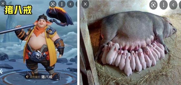 左:西游记猪八戒, 右:母猪喂小猪崽吃奶