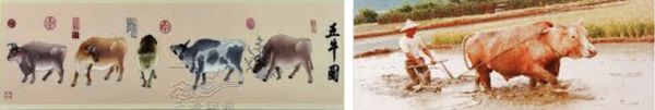 左:唐代画家韩滉的作品《五牛图》, 右:农耕牛犁田