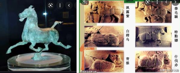 左:汉朝青铜《马踏飞燕》,右:唐皇李世民战马六骏
