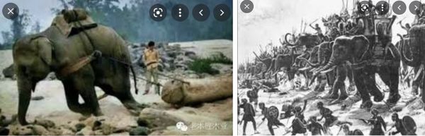 左:大象牵拉木材, 右:古代缅甸战象阵容
