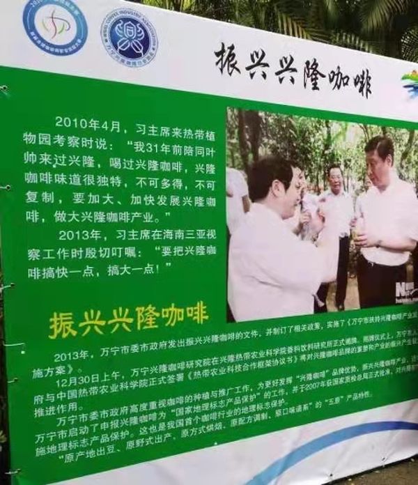 2010年4月,习近平主席在热带植物园考察时说:“我31年前陪同叶帅来过兴隆,喝过兴隆咖啡,兴隆咖啡味道很独特,不可多得,不可复制,要加大、加快发展兴隆咖啡,做大兴隆咖啡产业。”