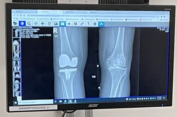 由于膝关节越来越疼痛,所以 夫君煜群和二弟志文陪同我到医院,还是请那位曾经给妈妈置换 过膝关节的印度医生帮我置换膝关节,医生要我先照膝关节X光,之后,医生告诉我,我的膝关节因各种原因发生磨损、软骨己被侵蚀掉了,还有骨刺,