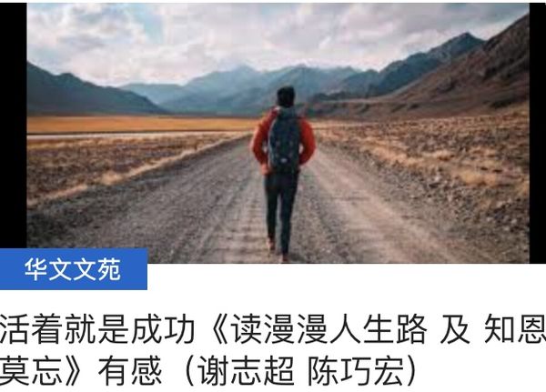 2022年元旦,我照常打开南加州缅华网,南友谢志超的短文"活着就是成功",吸引了我的眼球。一,包括不到一行的第一段,全文只有六小段。我有近百位微信朋友,每天均有超过百条讯息,深恐遇到长文。二,文中只提了年轻时出海谋生的一段经历。我已年迈退脑,小时候的经历,连鸡毛蒜皮,仍记忆犹新,眼前的经历,却过景忘情,喜欢阅读只讲一,两件事的文章。三,全文只提了其他两位作者,人物甚少。我记性每每日下,乐意看到人物较少的作品。四,评论处有作者的短文,内有伏笔,准备继续写文章,说明作者的短文不是昙花一现,不是短暂心血来潮,而是一个开头,后有续文期待。这更是作者内心期盼。