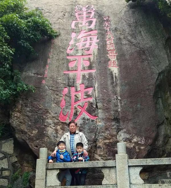 所有游客一下子集中到东澳码头,一时间人头攒动,在离开东澳码头之前,我带外孙到附近看摩崖石刻《万海平波》四个超大刻字。