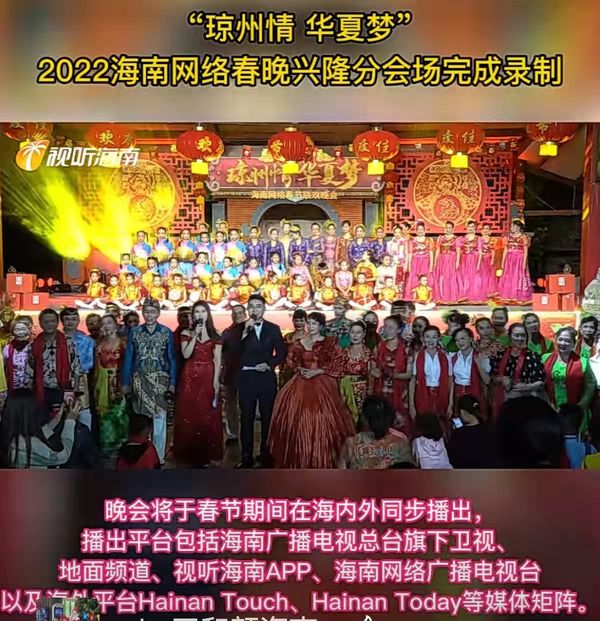 2022年1月24日晚,由海南海外联谊会、海南广播电视总台(集团)、海南省侨办、海南省港澳办、海南省台办主办;海南省互联网信息办、海南省外事办、海南省旅游和文化广电体育厅、海南省归国华侨联合会、海南欧美同学会(海南留学人员联谊会)、海南省工商联(总商会)、海南省新的社会阶层人士联谊会、万宁市兴隆华侨农场、保亭黎苗族自治县融媒体中心、保亭黎苗族自治县归国华侨联合会协办;海南广播电视总台国际传媒体中心、海南视听网络有限公司承办;特别受鸣谢的中国移动通信集团海南有限公司、兴隆热带花园和海南槟榔谷黎苗文化旅游区,以上单位联手在万宁市兴隆华侨农场巴厘岛旅游景区舞台分会场,为春节录制了一台精彩的文艺晚会节目,将于2月2日(大年初二)20:00在海南公共频道、视听海南客户端、海南IPTV首播。