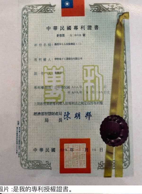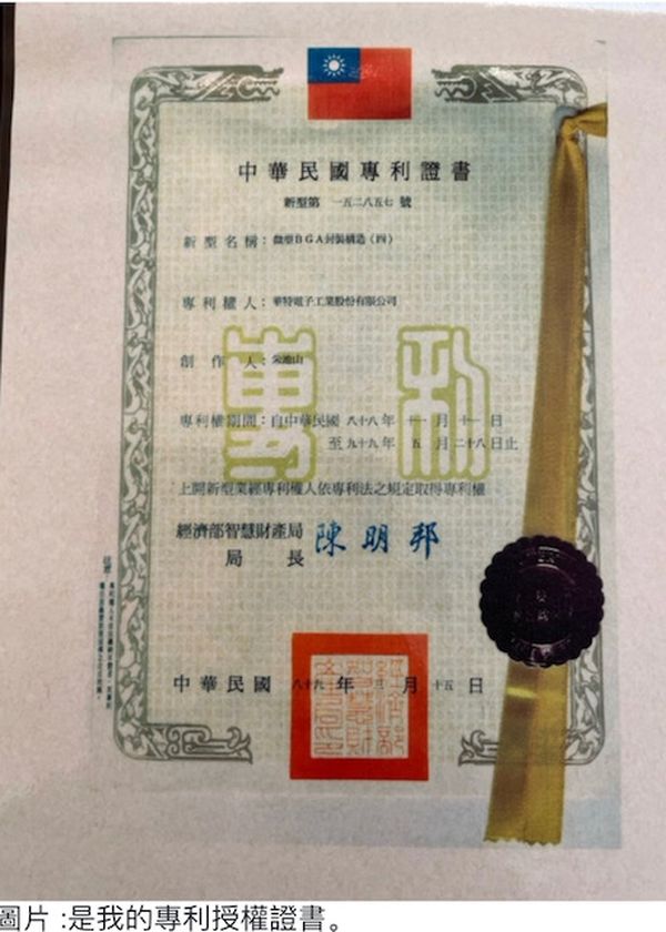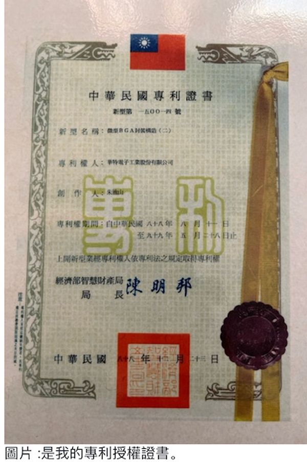 我是缅甸华人,1982年移民到美国,在4月初就进入国家半导体(National Semiconductor) 工作,开始我人生的半导体事业。那时候,同事互相交流时都会谈到发明专利,创新专利等,我们发现封装内部结构制造过程都有很多的专利。所以,我们就非常注重自己的产品有没有对别的公司的专利产生侵权的可能性。公司也鼓励工程师在创新,发明,新的设计上申请专利。保护公司的产品。我在不同的公司工作了十六年后, 1998年,我应聘担任总经理,回中国台湾工作,发现这家上市公司没有任何专利来保护自己的产品。所以我决定为公司写专利。向中国台湾经济部智慧财产局申请。申请后经过审查,一年后1999年才收到专利授权证。