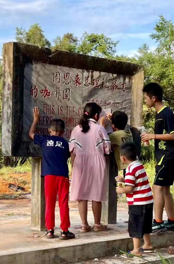 看着你们——三年来日夜守护着"周恩来总理视察过的咖啡园"纪念碑的老少义工们,我们为你们高喊一声:"乌啦"!
