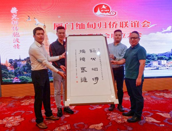 而后,思明区侨联青委会会长魏剑与侨青、书法作者吴毅飞向缅联会青委会赠送了《薪火相传 接续奋进》的祝贺书法作品。