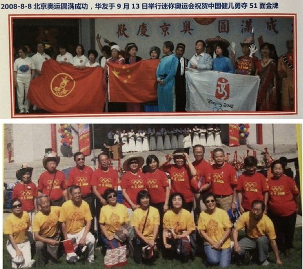2008年8月8日,世界瞩目的北京奥运会隆重开幕。我们洛杉矶华友于9月13日举行迷你奥运会祝贺中国运动员勇夺51枚金牌的好成绩。在之前我们洛杉矶华友为庆祝北京奥运圆满成功,特别制作短袖T恤,分红黄两色,T血胸前印有奥运五环图,五环图下面印有北京2008字样,左袖上面印有华友标志图,T血背后印有京奥标志图和Beijing2008。在庆祝京奥圆满成功那天,校友们都穿着红色或黄色T血来,那天北加州华友也派代表来参加,他们是穿着白色印有华友标志图的T血。
