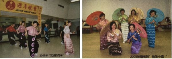 2003年9月27日洛杉矶华友(当时华友会主席已是张少战)在柔似密社区举行年度联欢晚会。在晚会上我参加了由黄娟娟同学编导,由罗彩萍、伍秀美、黄月琴、朱雪璇、邱丽琴、梁瑛金、黄娟娟表演的缅甸舞"瓦城的花朶"。