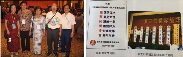 2013年第七届世界缅华同侨联谊大会首次在第二故乡缅甸仰光举行。我们夫妇俩也前往参加。大会期间与会华友一同摄影畄念,我有幸参加拍照,做为永久的纪念,"百年华中情"特刊P192页有刊登。