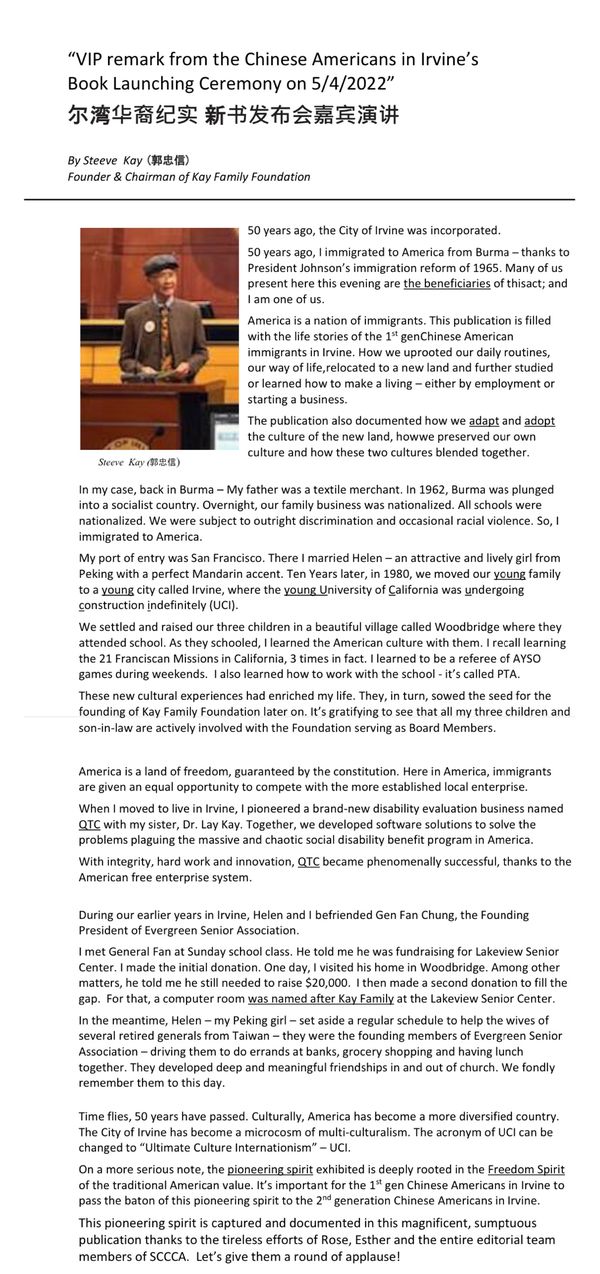 3. 郭忠信先生在 尔湾建市50周年纪念书籍 “ 尔湾华裔纪实” 新书发布会上发表的英文演讲。